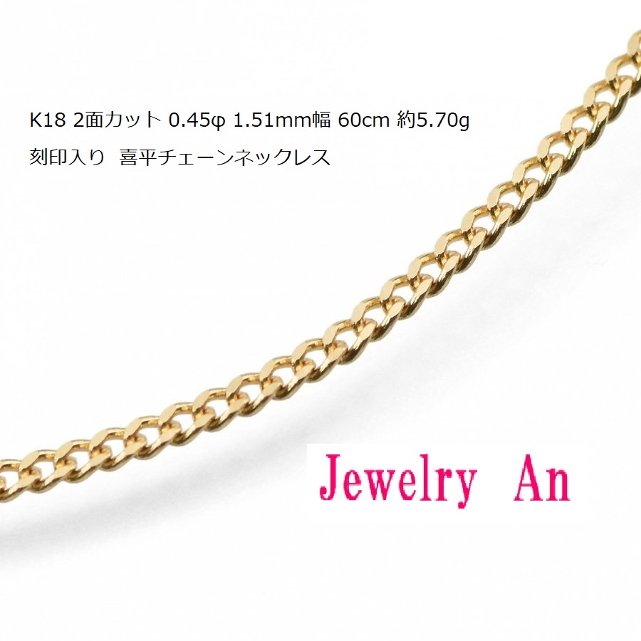 18金 喜平 チェーンネックレス K18 2面カット 0.45φ 1.51mm幅 60cm 約5.70g 刻印入り メンズ レディース キヘイ チェーン 2022年7月12日2022年7月12日 | shopmastershopmaster | 0 Comment | 12:00 AM Categories: 18金 2面 ゴールド 商品 18金 喜平 チェーンネックレス K18 2面カット 0.45φ 1.51mm幅 60cm 約5.70g 刻印入り メンズ レディース キヘイ チェーン (K18N023) 定価(税込)¥80,615販売価格(税込)¥80,615在庫状態 : 在庫有り細見のチェーンですので、小ぶりのトップに最適です。プレゼントにもどうぞ! 商品説明 素材 K18(留具プレートに刻印入り) サイズ 太さ:約1.51mm(線径0.45φ) 総重量:約5.70g前後 全長:約60cm 留め金具 引輪 注意 ” ” 2面喜平の特徴 「K」とは、カラット(karat)の頭文字となりまして、金製品に金が含まれる純度を24分率で示す単位となります。 K24が1番高い金の含有率100%(純金)となり、K18とは金の含有率が75%のものを指します。 これがいわゆる18金(じゅうはちきん)と呼ばれるものです。 【K18と18Kの違い】 K18などのKが前にあらわす刻印は、主に日本国内で製造された製品に使用されることが多く、18KなどのKがうしろにあらわす刻印は日本以外のアジア各国などで製造された製品に使用されることが多いようです。 K18と18Kとでは、日本の貴金属買取業者の間だと、K18の方が信用度が高いとされます。 新品、当店保証書付 送料・代引き手数料無料 長さ 60cm重量 約5.70g前後 幅 約1.51mm(線径0.45φ)素材(刻印):K18 刻印デザイン:喜平(2面)留め金具:引輪” 数量個 投稿ナビゲーション PREVIOUS Previous post: 18金 喜平 チェーンネックレス K18 2面カット 0.45φ 1.51mm幅 50cm 約4.80g 造幣局検定マーク 刻印入り メンズ レディース キヘイ チェーンNEXT Next post: K18 チェーン ネックレス キヘイ メンズ レディース 2面 0.49φ-40cm-4.50g Related Post 18金 喜平 チェーンネックレス K18 2面カット 0.40φ 1.34mm幅 50cm 約3.80g 造幣局検定マーク 刻印入り メンズ レディース キヘイ チェーン 2022年7月12日2022年7月12日 | shopmastershopmaster | 0 Comment 18金 喜平 チェーンネックレス K18 2面カット 0.40φ 1.34mm幅 50cm 約3.80g 造幣局検定マーク 刻印入り メンズ レディース キヘイ チェーン (K18N017) 定価(税込)¥5 […] Read MoreRead More 純プラチナ 喜平 ネックレス PT999 2面カット 10g 50cm 造幣局検定マーク 刻印入り メンズ レディース キヘイ チェーン 2022年7月12日2022年7月12日 | shopmastershopmaster | 0 Comment 純プラチナ 喜平 ネックレス PT999 2面カット 10g 50cm 造幣局検定マーク 刻印入り メンズ レディース キヘイ チェーン (PT10002DC10G-50) 定価(税込)¥80,259販売価格 […] Read MoreRead More 18金 喜平 ブレスレット K18 トリプル8面カット 20g 18cm 造幣局検定マーク 刻印入り メンズ レディース キヘイ チェーン 2022年7月12日2022年7月12日 | shopmastershopmaster | 0 Comment 18金 喜平 ブレスレット K18 トリプル8面カット 20g 18cm 造幣局検定マーク 刻印入り メンズ レディース キヘイ チェーン (k18tr8c20g18cm) 定価(税込)¥235,321販売価 […] Read MoreRead More