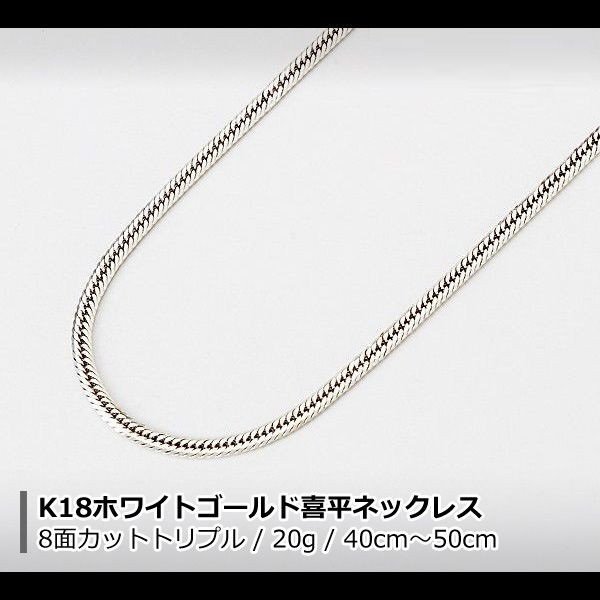 18金 ホワイトゴールド 喜平 ネックレス K18WG 8面カットトリプル 20g 40cm 50cm 造幣局検定マーク 刻印入り メンズ レディース キヘイ チェーン 2022年7月12日2022年7月12日 | shopmastershopmaster | 0 Comment | 12:00 AM Categories: 18金 8面 ホワイトゴールド 商品 18金 ホワイトゴールド 喜平 ネックレス K18WG 8面カットトリプル 20g 40cm 50cm 造幣局検定マーク 刻印入り メンズ レディース キヘイ チェーン (K18WG8TDC20g) 定価(税込)¥271,408販売価格(税込)¥271,408在庫状態 : 在庫有り重量感・光沢・しなやかさは最高位。究極の喜平チェーン付属品:ネックレスケース サイズ詳細 20g 長さcm 幅mm 厚みmm 金具 40cm 4.3mm 1.7mm 中折 50cm 3.7mm 1.6mm 中折 ” ” K18ゴールドとは 「K」とは、カラット(karat)の頭文字となりまして、金製品に金が含まれる純度を24分率で示す単位となります。 K24が1番高い金の含有率100%(純金)となり、K18とは金の含有率が75%のものを指します。 これがいわゆる18金(じゅうはちきん)と呼ばれるものです。 【K18と18Kの違い】 K18などのKが前にあらわす刻印は、主に日本国内で製造された製品に使用されることが多く、18KなどのKがうしろにあらわす刻印は日本以外のアジア各国などで製造された製品に使用されることが多いようです。 K18と18Kとでは、日本の貴金属買取業者の間だと、K18の方が信用度が高いとされます。 シンプルな定番のデザインでありながら存在感があり、ファッションにも合わせやすいアイテムです。 男性だけでなく、女性にもご愛用いただけます。 普通のタイプ(シングル喜平)は、ひとつのコマに次のコマがかかっていますが、トリプル喜平の場合、ひとつのコマに3つのコマがかかってますので豪華です ホワイトゴールド 喜平※刻印K18WG すべて造幣局検定マーク付 新品、当店保証書付 トリプル喜平の場合、ひとつのコマに3つのコマがかかってますので豪華です。【素材】K18WG/ホワイトゴールド(留具プレートに刻印入り) 【総重量】 20g【サイズ 40cm】 長さ:約40cm 幅 :約4.3mm 厚み:約1.7mm 金具:中折れ【サイズ 50cm】 長さ:約50cm 幅 :約3.7mm 厚み:約1.6mm 金具:中折れ【付属品】ネックレスケース【その他】新品、当店保証書付” 数量個 投稿ナビゲーション PREVIOUS Previous post: 18金 喜平 ブレスレット K18 8面カットトリプル 20g 18cm 20cm 造幣局検定マーク 刻印入り メンズ レディース キヘイ チェーンNEXT Next post: 18金 ホワイトゴールド 喜平 ブレスレット K18WG 8面カットトリプル 20g 18cm 20cm 造幣局検定マーク 刻印入り メンズ レディース キヘイ チェーン Related Post 18金 喜平 ブレスレット K18 6面カットダブル 100g 21cm シングルストッパー 造幣局検定マーク 刻印入り メンズ レディース キヘイ チェーン 2022年7月12日2022年7月12日 | shopmastershopmaster | 0 Comment 18金 喜平 ブレスレット K18 6面カットダブル 100g 21cm シングルストッパー 造幣局検定マーク 刻印入り メンズ レディース キヘイ チェーン (K186DCW100G21CS) 定価(税込) […] Read MoreRead More 18金 喜平 チェーンネックレス K18 2面カット 0.45φ 1.51mm幅 50cm 約4.80g 造幣局検定マーク 刻印入り メンズ レディース キヘイ チェーン 2022年7月12日2022年7月12日 | shopmastershopmaster | 0 Comment 18金 喜平 チェーンネックレス K18 2面カット 0.45φ 1.51mm幅 50cm 約4.80g 造幣局検定マーク 刻印入り メンズ レディース キヘイ チェーン (K18N022) 定価(税込)¥6 […] Read MoreRead More 18金 喜平 ブレスレット K18 6面カットダブル 30g 18cm 20cm 造幣局検定マーク 刻印入り メンズ レディース キヘイ チェーン 2022年7月12日2022年7月12日 | shopmastershopmaster | 0 Comment 18金 喜平 ブレスレット K18 6面カットダブル 30g 18cm 20cm 造幣局検定マーク 刻印入り メンズ レディース キヘイ チェーン (K186WDC30gBR) 定価(税込)¥345,187販 […] Read MoreRead More