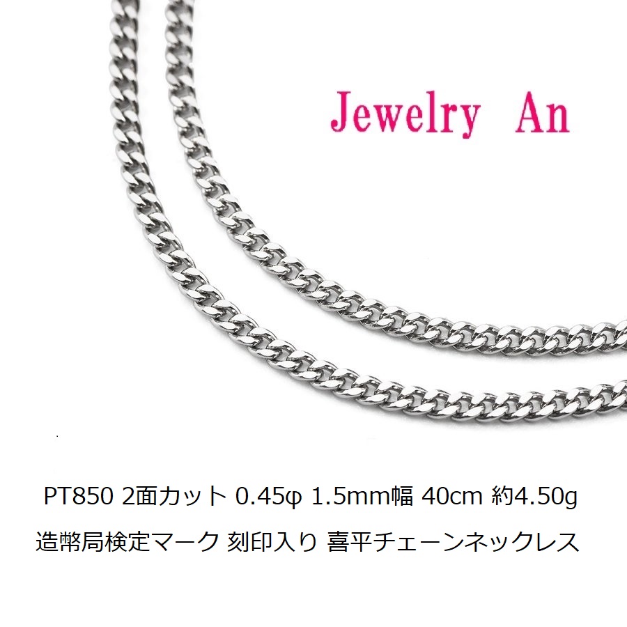 プラチナ850 喜平 チェーンネックレス PT850 2面カット 0.45φ 1.5mm幅 40cm 約4.50g 造幣局検定マーク 刻印入り メンズ レディース キヘイ チェーン 2022年7月12日2022年7月12日 | shopmastershopmaster | 0 Comment | 12:00 AM Categories: 18金 2面 プラチナ 商品 プラチナ850 喜平 チェーンネックレス PT850 2面カット 0.45φ 1.5mm幅 40cm 約4.50g 造幣局検定マーク 刻印入り メンズ レディース キヘイ チェーン (PT8500N13) 定価(税込)¥33,229販売価格(税込)¥33,229在庫状態 : 在庫有り細見のチェーンですので、小ぶりのトップに最適です。プレゼントにもどうぞ! 商品説明 素材 PT850(留具プレートに造幣局検定マーク刻印入り) サイズ 太さ:1.5mm(線径0.45φ) 総重量:約4.50g(入荷時期により若干の変動がございます) 全長:約40cm 引き輪含め約3cmアジャスター管付き引き輪サイズ:直径約6mmプレートサイズ:縦約8.4mm×横約2.9mmプレート下丸カン:直径約2.3mm 留め金具 引輪 注意 ” ” 2面喜平の特徴 「K」とは、カラット(karat)の頭文字となりまして、金製品に金が含まれる純度を24分率で示す単位となります。 K24が1番高い金の含有率100%(純金)となり、K18とは金の含有率が75%のものを指します。 これがいわゆる18金(じゅうはちきん)と呼ばれるものです。 【K18と18Kの違い】 K18などのKが前にあらわす刻印は、主に日本国内で製造された製品に使用されることが多く、18KなどのKがうしろにあらわす刻印は日本以外のアジア各国などで製造された製品に使用されることが多いようです。 K18と18Kとでは、日本の貴金属買取業者の間だと、K18の方が信用度が高いとされます。 ※送料及び代引き手数料無料! 新品、当店保証書付 他モールとの在庫を共有しているため、 システムのタイムラグにより 購入時在庫切れになる場合がございます ご注文後、在庫切れの場合は こちらからご連絡させて頂きます。 申し訳ございませんが予めご了承くださいませ。 長さ 40cm重量 約4.50g(入荷時期により若干の変動がございます) 幅 約1.5mm(線径0.45φ)素材(刻印):PT850 造幣局検定マーク刻印デザイン:喜平(2面)留め金具:引輪引き輪含め約3cmアジャスター管付き引き輪サイズ:直径約6mmプレートサイズ:縦約8.4mm×横約2.9mmプレート下丸カン:直径約2.3mm” 数量個 投稿ナビゲーション PREVIOUS Previous post: プラチナ850 喜平 チェーンネックレス PT850 2面カット 0.40φ 1.3mm幅 50cm 約4.32g 刻印入り メンズ レディース キヘイ チェーンNEXT Next post: プラチナ850 喜平 チェーンネックレス PT850 2面カット 0.45φ 1.5mm幅 43cm 約4.93g 刻印入り メンズ レディース キヘイ チェーン Related Post 18金 喜平 ブレスレット K18 6面カットダブル 20g 20cm 造幣局検定マーク 刻印入り メンズ レディース キヘイ チェーン 2022年7月12日2022年7月12日 | shopmastershopmaster | 0 Comment 18金 喜平 ブレスレット K18 6面カットダブル 20g 20cm 造幣局検定マーク 刻印入り メンズ レディース キヘイ チェーン (K186WDC20gBR) 定価(税込)¥239,970販売価格(税 […] Read MoreRead More プラチナ850 喜平 ネックレス PT850 8面カットトリプル 50g 50cm 60cm 造幣局検定マーク 刻印入り メンズ レディース キヘイ チェーン 2022年7月12日2022年7月12日 | shopmastershopmaster | 0 Comment プラチナ850 喜平 ネックレス PT850 8面カットトリプル 50g 50cm 60cm 造幣局検定マーク 刻印入り メンズ レディース キヘイ チェーン (Pt8TDC50g) 定価(税込)¥364,6 […] Read MoreRead More 18金 喜平 ブレスレット K18 12面カットトリプル 20g 20cm 造幣局検定マーク 刻印入り メンズ レディース キヘイ チェーン 2022年7月12日2022年7月12日 | shopmastershopmaster | 0 Comment 18金 喜平 ブレスレット K18 12面カットトリプル 20g 20cm 造幣局検定マーク 刻印入り メンズ レディース キヘイ チェーン (K1812TDR20G20-3) 定価(税込)¥262,256販 […] Read MoreRead More