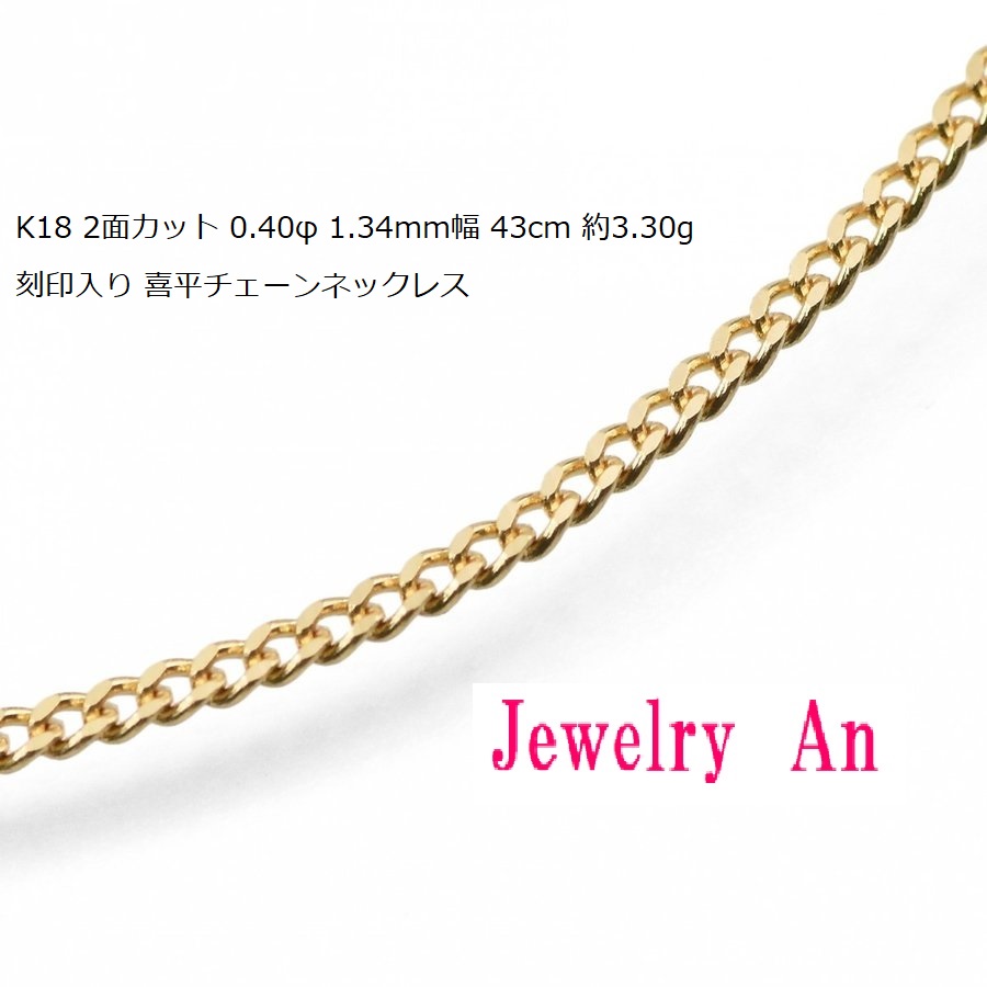 18金 喜平 チェーンネックレス K18 2面カット 0.40φ 1.34mm幅 43cm 約3.30g 刻印入り メンズ レディース キヘイ チェーン18金 喜平 チェーンネックレス K18 2面カット 0.40φ 1.34mm幅 43cm 約3.30g 刻印入り メンズ レディース キヘイ チェーン