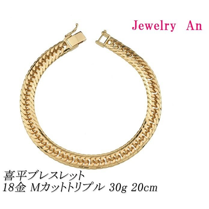 18金 喜平 ブレスレット K18 Mカットトリプル 30g 20cm 造幣局検定マーク 刻印入り メンズ レディース キヘイ チェーン18金 喜平 ブレスレット K18 Mカットトリプル 30g 20cm 造幣局検定マーク 刻印入り メンズ レディース キヘイ チェーン